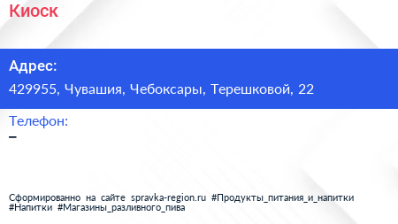 Киоск по адресу 429955, Чувашия, Чебоксары, Терешковой, 22 в дальнейшем Организация, размещена в следующих категориях: