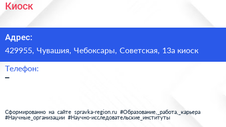 Киоск по адресу 429955, Чувашия, Чебоксары, Советская, 13а киоск в дальнейшем Организация, размещена в следующих категориях: