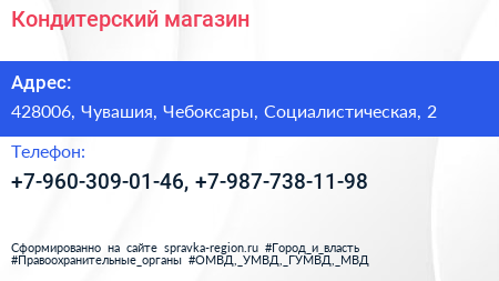 Кондитерский магазин по адресу 428006, Чувашия, Чебоксары, Социалистическая, 2 в дальнейшем Организация, размещена в следующих категориях: