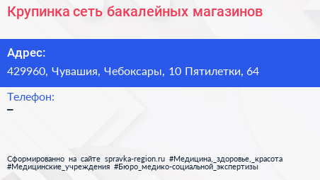 Крупинка, сеть бакалейных магазинов по адресу 429960, Чувашия, Чебоксары, 10 Пятилетки, 64 в дальнейшем Организация, размещена в следующих категориях: