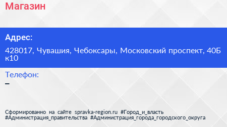 Магазин по адресу 428017, Чувашия, Чебоксары, Московский проспект, 40Б к10 в дальнейшем Организация, размещена в следующих категориях: