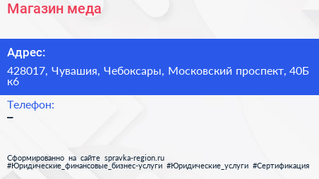 Магазин меда по адресу 428017, Чувашия, Чебоксары, Московский проспект, 40Б к6 в дальнейшем Организация, размещена в следующих категориях: