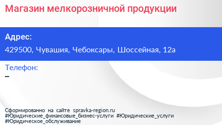 Магазин мелкорозничной продукции по адресу 429500, Чувашия, Чебоксары, Шоссейная, 12а в дальнейшем Организация, размещена в следующих категориях:
