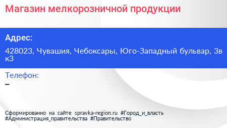Магазин мелкорозничной продукции по адресу 428023, Чувашия, Чебоксары, Юго-Западный бульвар, 3в к3 в дальнейшем Организация, размещена в следующих категориях: