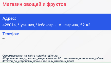 Магазин овощей и фруктов по адресу 428014, Чувашия, Чебоксары, Ашмарина, 59 к2 в дальнейшем Организация, размещена в следующих категориях: