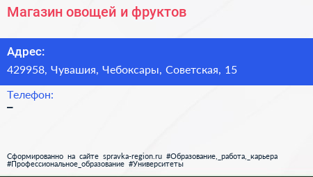 Магазин овощей и фруктов по адресу 429958, Чувашия, Чебоксары, Советская, 15 в дальнейшем Организация, размещена в следующих категориях: