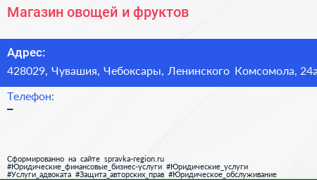 Магазин овощей и фруктов по адресу 428029, Чувашия, Чебоксары, Ленинского Комсомола, 24а в дальнейшем Организация, размещена в следующих категориях: