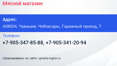 Мясной магазин по адресу 428024, Чувашия, Чебоксары, Гаражный проезд, 7 в дальнейшем Организация, размещена в следующих категориях: