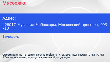 Мясоежка по адресу 428017, Чувашия, Чебоксары, Московский проспект, 40Б к10 в дальнейшем Организация, размещена в следующих категориях: