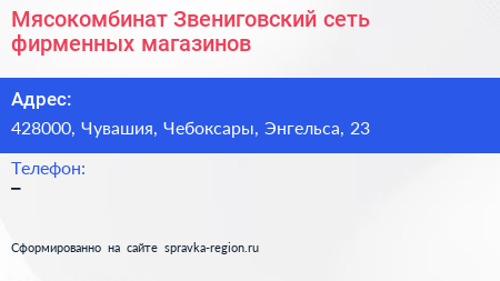Мясокомбинат Звениговский, сеть фирменных магазинов по адресу 428000, Чувашия, Чебоксары, Энгельса, 23 в дальнейшем Организация, размещена в следующих категориях:
