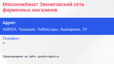 Мясокомбинат Звениговский, сеть фирменных магазинов по адресу 428014, Чувашия, Чебоксары, Ашмарина, 19 в дальнейшем Организация, размещена в следующих категориях: