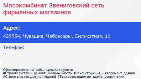 Мясокомбинат Звениговский, сеть фирменных магазинов по адресу 429954, Чувашия, Чебоксары, Силикатная, 16 в дальнейшем Организация, размещена в следующих категориях: