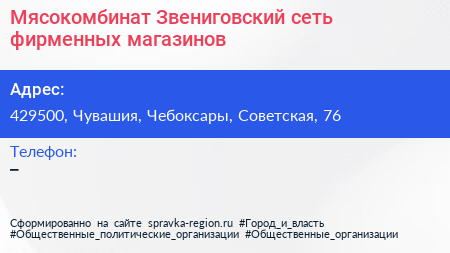 Мясокомбинат Звениговский, сеть фирменных магазинов по адресу 429500, Чувашия, Чебоксары, Советская, 76 в дальнейшем Организация, размещена в следующих категориях: