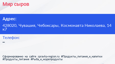Мир сыров по адресу 428020, Чувашия, Чебоксары, Космонавта Николаева, 14 к7 в дальнейшем Организация, размещена в следующих категориях: