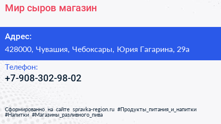 Мир сыров, магазин по адресу 428000, Чувашия, Чебоксары, Юрия Гагарина, 29а в дальнейшем Организация, размещена в следующих категориях: