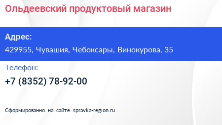 Ольдеевский, продуктовый магазин по адресу 429955, Чувашия, Чебоксары, Винокурова, 35 в дальнейшем Организация, размещена в следующих категориях: