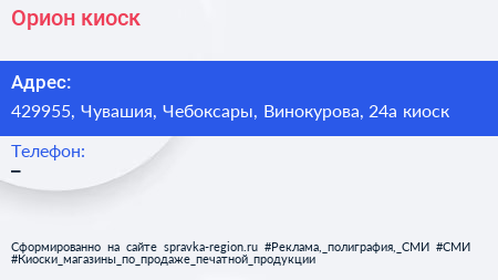 Орион, киоск по адресу 429955, Чувашия, Чебоксары, Винокурова, 24а киоск в дальнейшем Организация, размещена в следующих категориях: