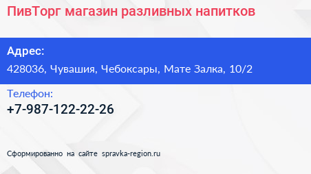 ПивТорг, магазин разливных напитков по адресу 428036, Чувашия, Чебоксары, Мате Залка, 10/2 в дальнейшем Организация, размещена в следующих категориях:
