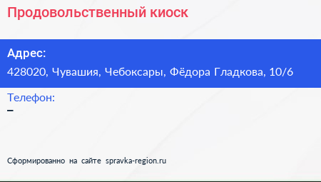 Продовольственный киоск по адресу 428020, Чувашия, Чебоксары, Фёдора Гладкова, 10/6 в дальнейшем Организация, размещена в следующих категориях: