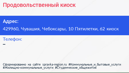 Продовольственный киоск по адресу 429960, Чувашия, Чебоксары, 10 Пятилетки, 62 киоск в дальнейшем Организация, размещена в следующих категориях: