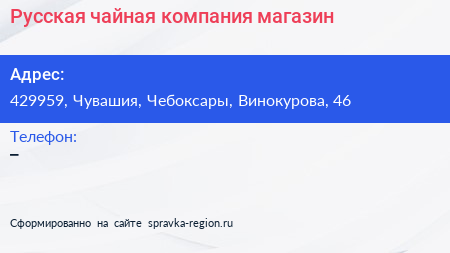 Русская чайная компания, магазин по адресу 429959, Чувашия, Чебоксары, Винокурова, 46 в дальнейшем Организация, размещена в следующих категориях: