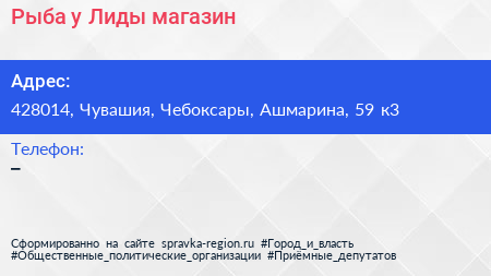 Рыба у Лиды, магазин по адресу 428014, Чувашия, Чебоксары, Ашмарина, 59 к3 в дальнейшем Организация, размещена в следующих категориях: