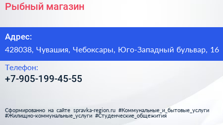 Рыбный магазин по адресу 428038, Чувашия, Чебоксары, Юго-Западный бульвар, 16 в дальнейшем Организация, размещена в следующих категориях: