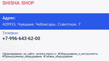 SHISHA SHOP по адресу 429955, Чувашия, Чебоксары, Советская, 7 в дальнейшем Организация, размещена в следующих категориях: