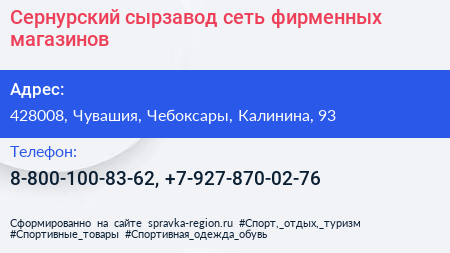 Сернурский сырзавод, сеть фирменных магазинов по адресу 428008, Чувашия, Чебоксары, Калинина, 93 в дальнейшем Организация, размещена в следующих категориях: