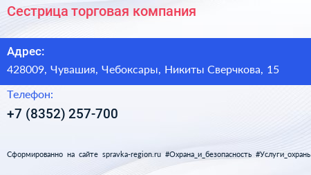 Сестрица, торговая компания по адресу 428009, Чувашия, Чебоксары, Никиты Сверчкова, 15 в дальнейшем Организация, размещена в следующих категориях: