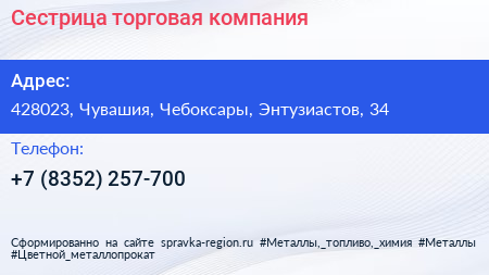 Сестрица, торговая компания по адресу 428023, Чувашия, Чебоксары, Энтузиастов, 34 в дальнейшем Организация, размещена в следующих категориях: