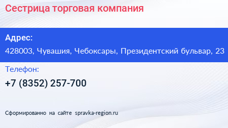 Сестрица, торговая компания по адресу 428003, Чувашия, Чебоксары, Президентский бульвар, 23 в дальнейшем Организация, размещена в следующих категориях: