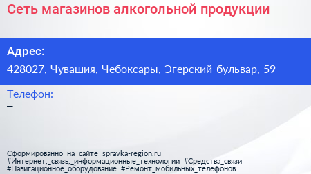 Сеть магазинов алкогольной продукции по адресу 428027, Чувашия, Чебоксары, Эгерский бульвар, 59 в дальнейшем Организация, размещена в следующих категориях:
