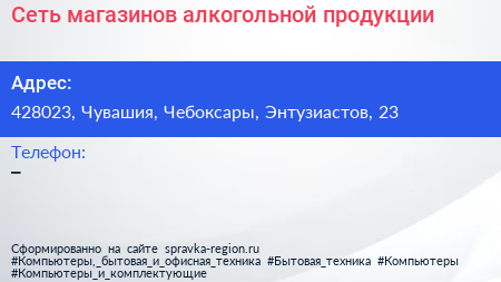 Сеть магазинов алкогольной продукции по адресу 428023, Чувашия, Чебоксары, Энтузиастов, 23 в дальнейшем Организация, размещена в следующих категориях: