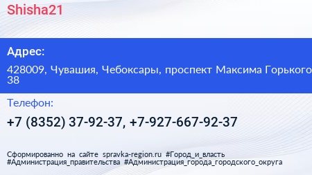 Shisha21 по адресу 428009, Чувашия, Чебоксары, проспект Максима Горького, 38 в дальнейшем Организация, размещена в следующих категориях: