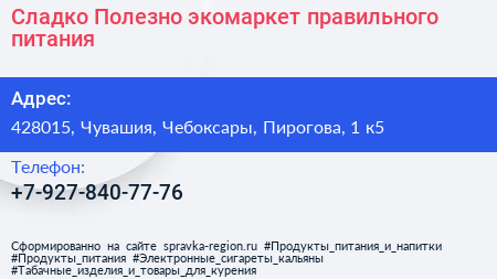 Сладко Полезно, экомаркет правильного питания по адресу 428015, Чувашия, Чебоксары, Пирогова, 1 к5 в дальнейшем Организация, размещена в следующих категориях: