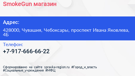 SmokeGun, магазин по адресу 428000, Чувашия, Чебоксары, проспект Ивана Яковлева, 4Б в дальнейшем Организация, размещена в следующих категориях: