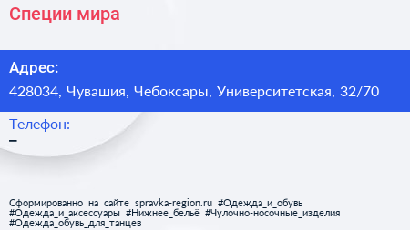Специи мира по адресу 428034, Чувашия, Чебоксары, Университетская, 32/70 в дальнейшем Организация, размещена в следующих категориях: