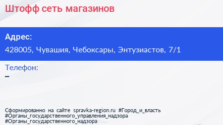 Штофф, сеть магазинов по адресу 428005, Чувашия, Чебоксары, Энтузиастов, 7/1 в дальнейшем Организация, размещена в следующих категориях: