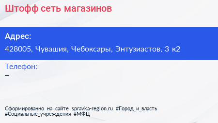 Штофф, сеть магазинов по адресу 428005, Чувашия, Чебоксары, Энтузиастов, 3 к2 в дальнейшем Организация, размещена в следующих категориях: