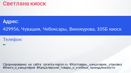 Светлана, киоск по адресу 429956, Чувашия, Чебоксары, Винокурова, 105Б киоск в дальнейшем Организация, размещена в следующих категориях: