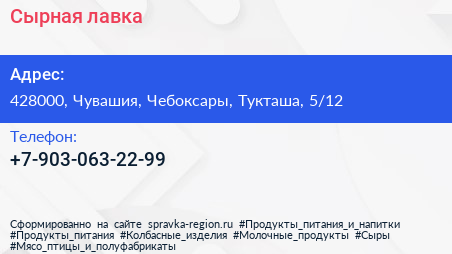 Сырная лавка по адресу 428000, Чувашия, Чебоксары, Тукташа, 5/12 в дальнейшем Организация, размещена в следующих категориях: