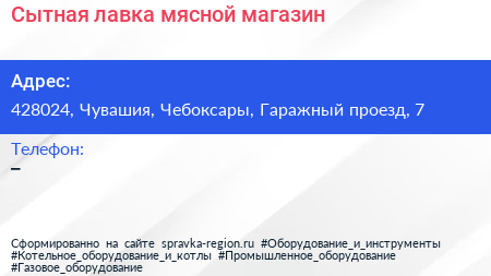 Сытная лавка, мясной магазин по адресу 428024, Чувашия, Чебоксары, Гаражный проезд, 7 в дальнейшем Организация, размещена в следующих категориях: