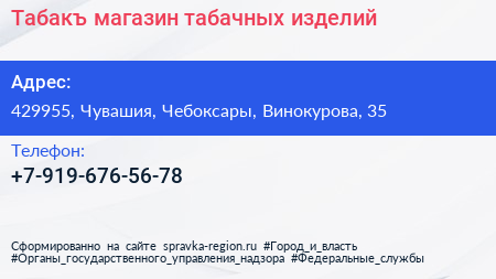 Табакъ, магазин табачных изделий по адресу 429955, Чувашия, Чебоксары, Винокурова, 35 в дальнейшем Организация, размещена в следующих категориях: