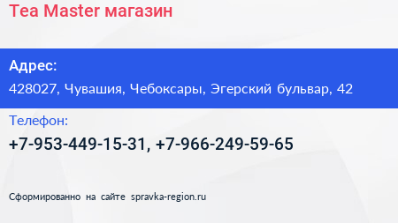 Tea Master, магазин по адресу 428027, Чувашия, Чебоксары, Эгерский бульвар, 42 в дальнейшем Организация, размещена в следующих категориях: