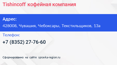 Tishincoff, кофейная компания по адресу 428008, Чувашия, Чебоксары, Текстильщиков, 13а в дальнейшем Организация, размещена в следующих категориях: