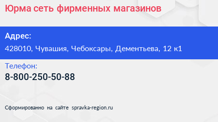 Юрма, сеть фирменных магазинов по адресу 428010, Чувашия, Чебоксары, Дементьева, 12 к1 в дальнейшем Организация, размещена в следующих категориях: