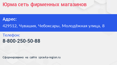 Юрма, сеть фирменных магазинов по адресу 429512, Чувашия, Чебоксары, Молодёжная улица, 8 в дальнейшем Организация, размещена в следующих категориях: