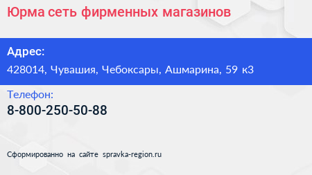 Юрма, сеть фирменных магазинов по адресу 428014, Чувашия, Чебоксары, Ашмарина, 59 к3 в дальнейшем Организация, размещена в следующих категориях: