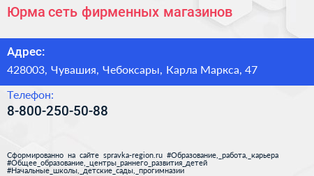 Юрма, сеть фирменных магазинов по адресу 428003, Чувашия, Чебоксары, Карла Маркса, 47 в дальнейшем Организация, размещена в следующих категориях: